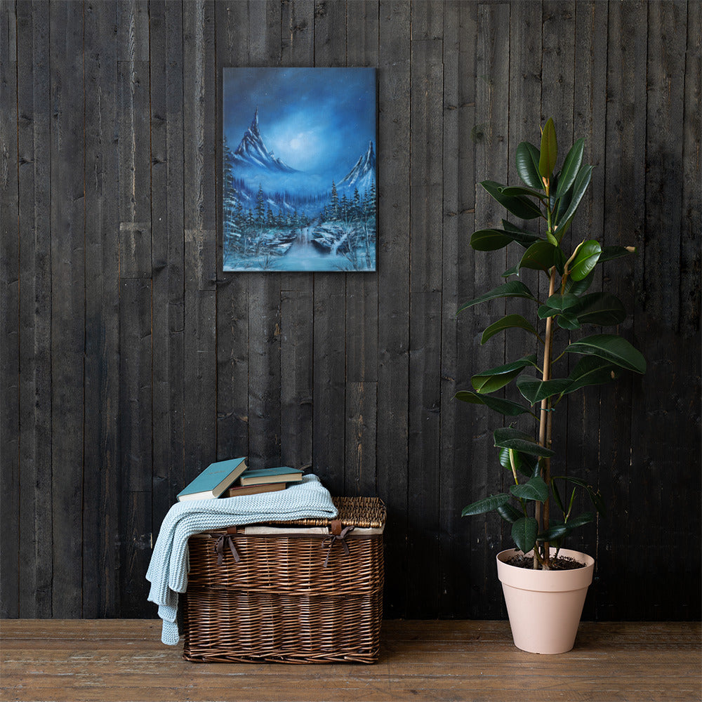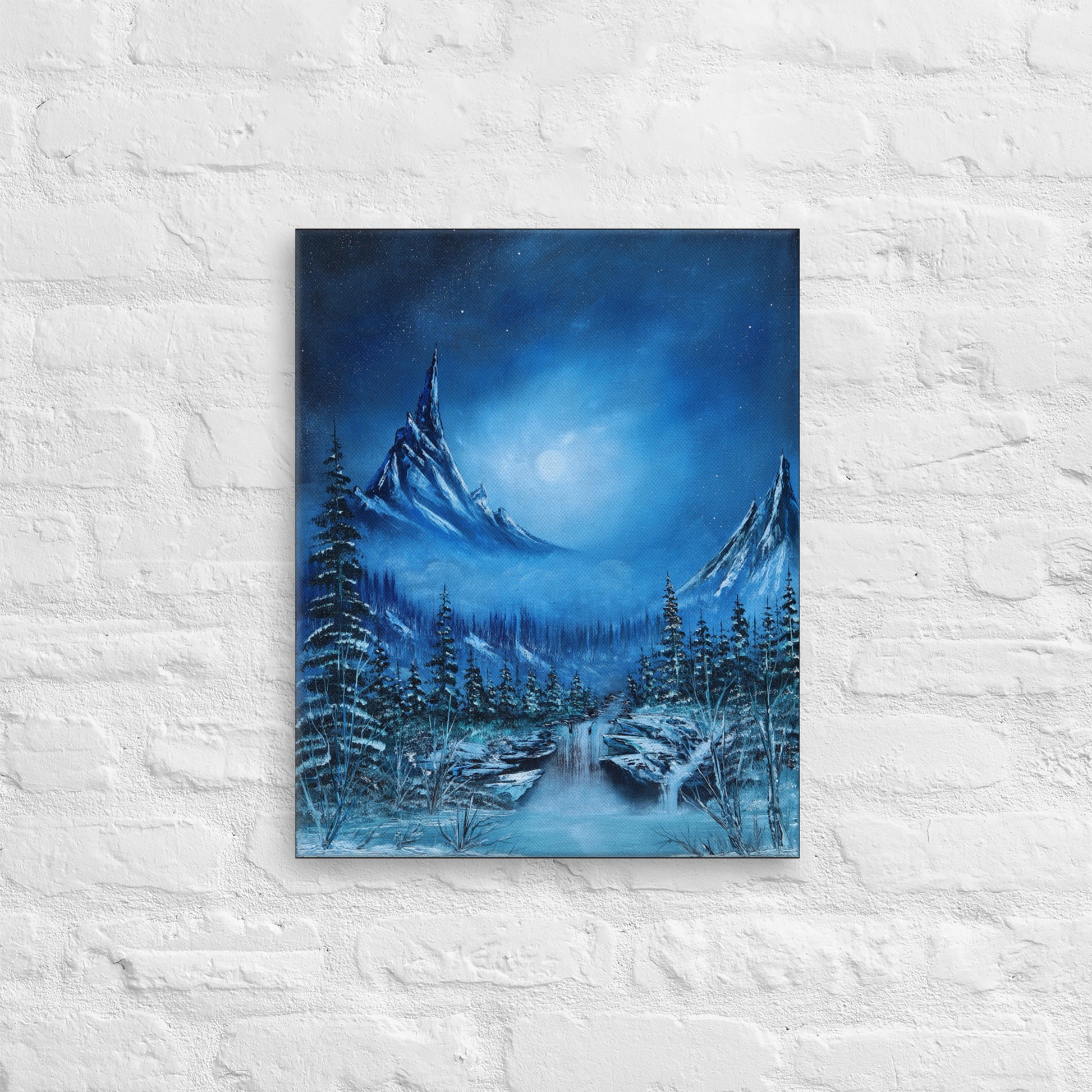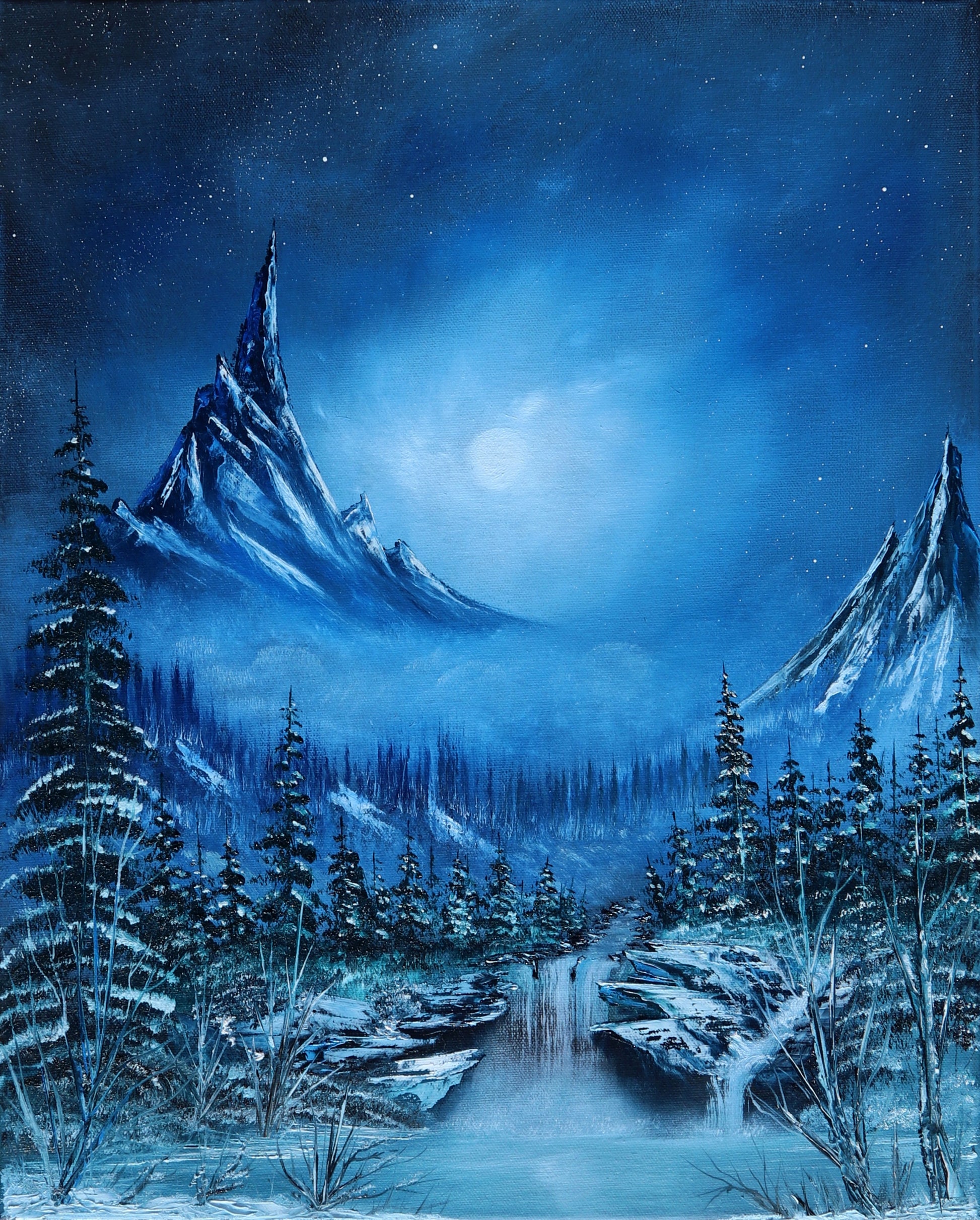 This surreal night sky is unlike any other. Featuring steep and ominous mountains that pierce into the star speckled sky and a fog lingering on the forests edge with a hidden waterfall. Influences of Mt. Crumpit and painted in Taos, New Mexico.
