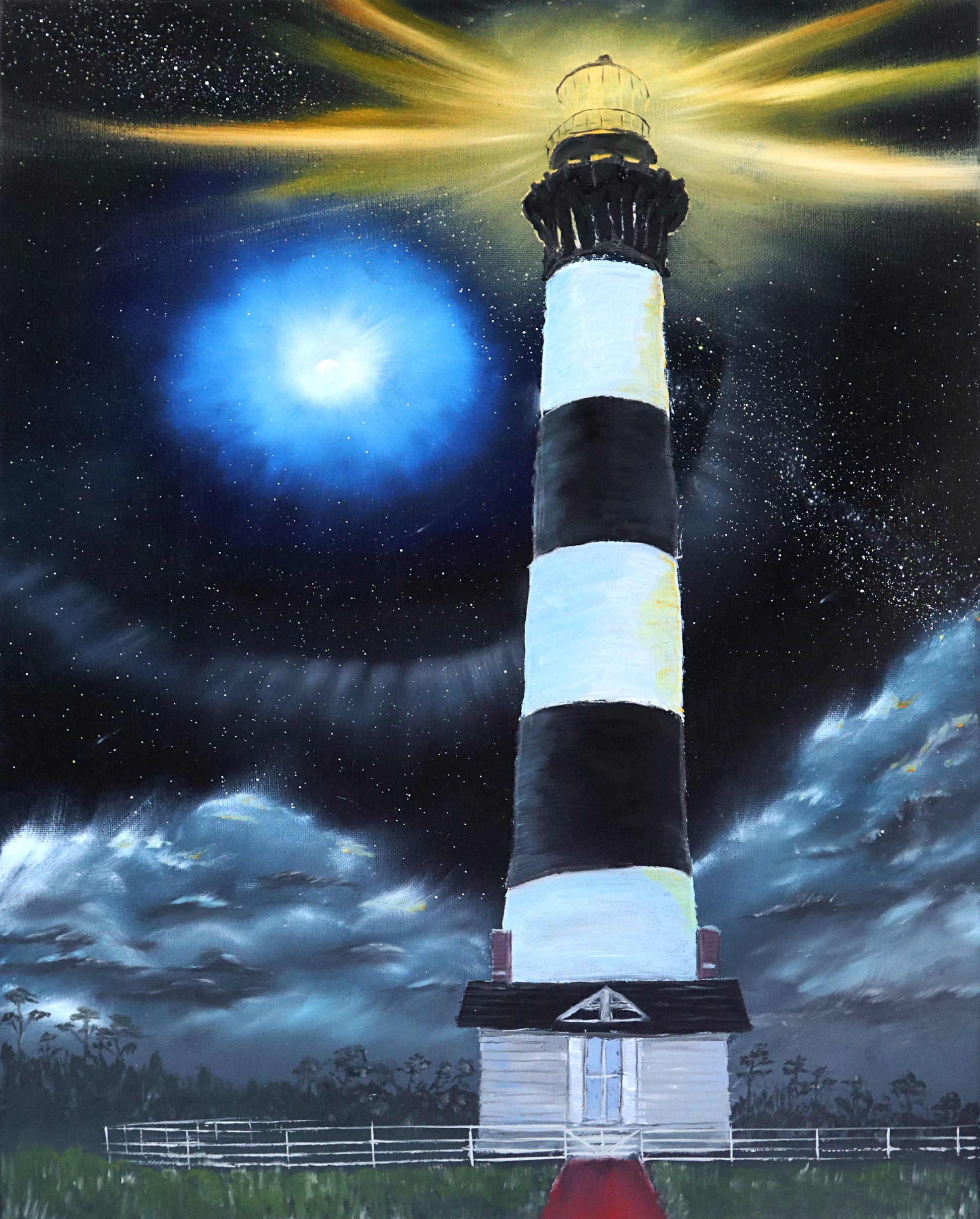 The brilliance of the Bodie Island Lighthouse is on full display in this piece accompanied by a striking full moon accompanied by a moon ring and the milky way cascading above.
