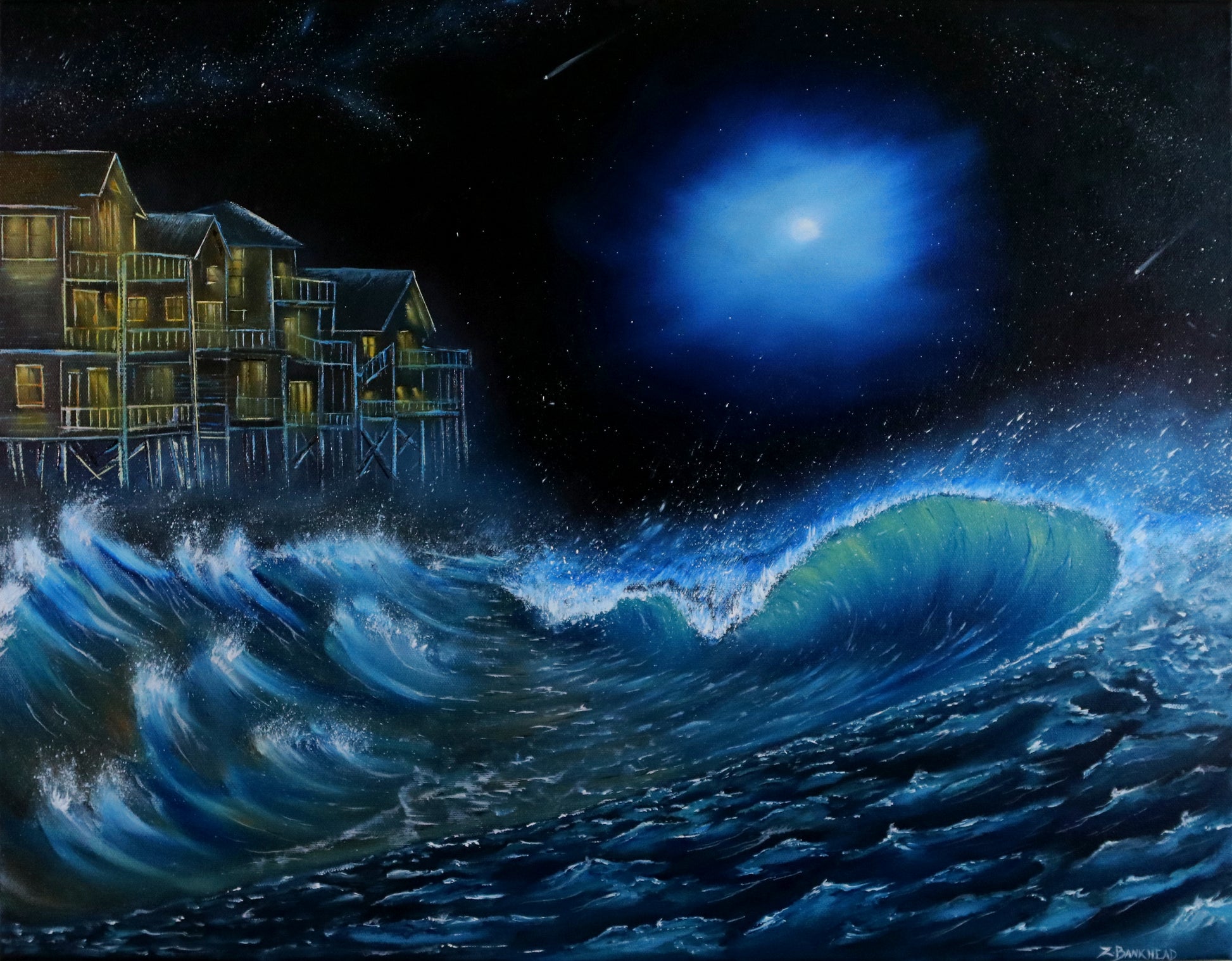 This piece highlights the immense night sky of the Outer Banks, midnight waves breaking along the shoreline under a full moon.