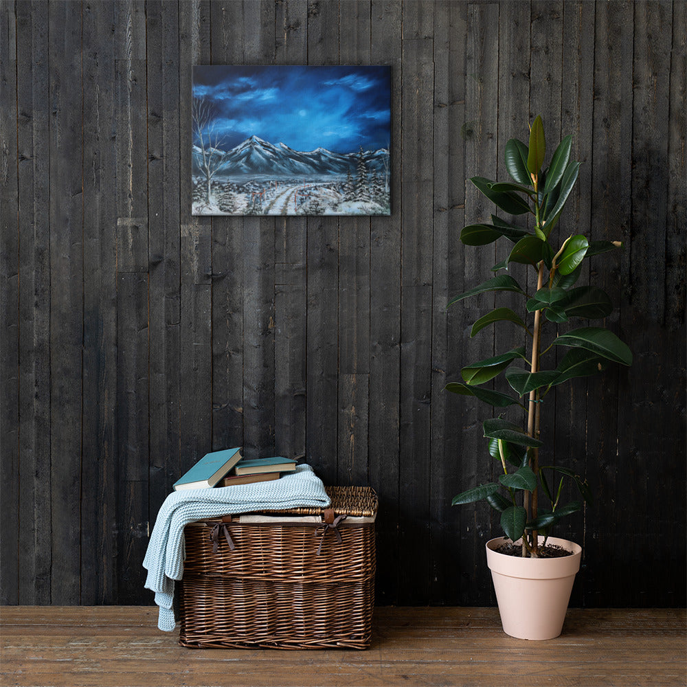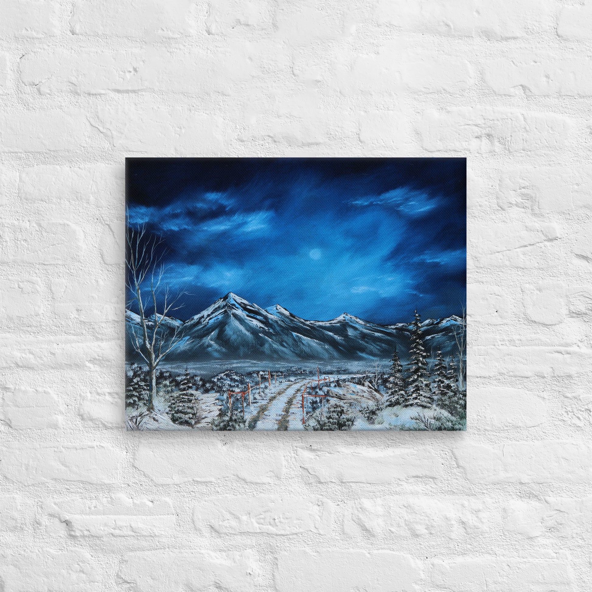 Inspired by the country roads of Taos and its moonlit sky's and it's surreal mountainous backdrop. This stunning piece captures the essence of Taos vibrant spirit in the night. The original was painted in Taos after the first snow of the season.