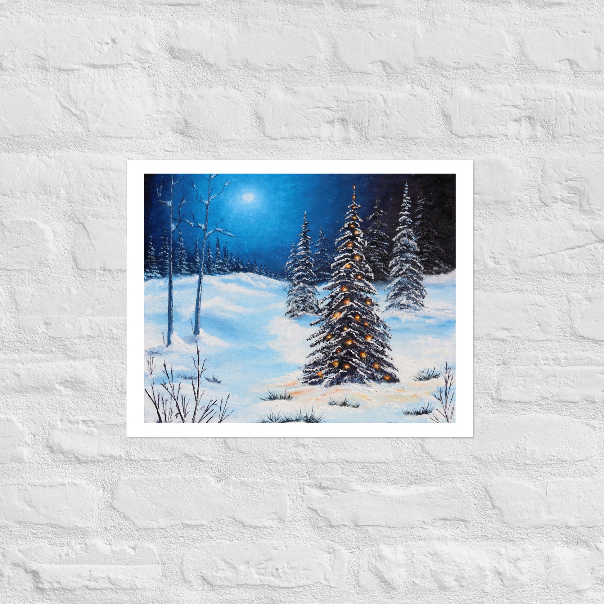 This is the first artwork of the Winter Collection. This moonlit holiday scene has inspirations of snowy serene nights in Colorado and Lake Tahoe, California. A snowy night luminated by the full moon and a glowing Christmas tree.